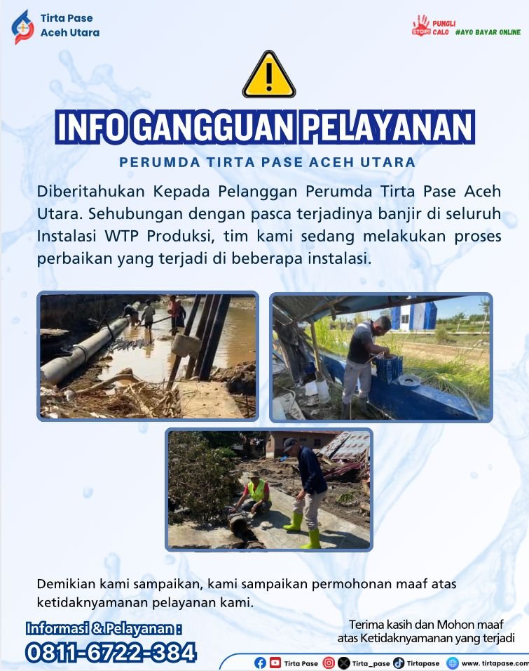 Sehubung Dengan Pasca Terjadinya Banjir di Seluruh Intalasi WTP Produksi, Tim Kami Sedang Melakukan Proses Perbaikan yang Terjadi di Beberapa Intalasi.