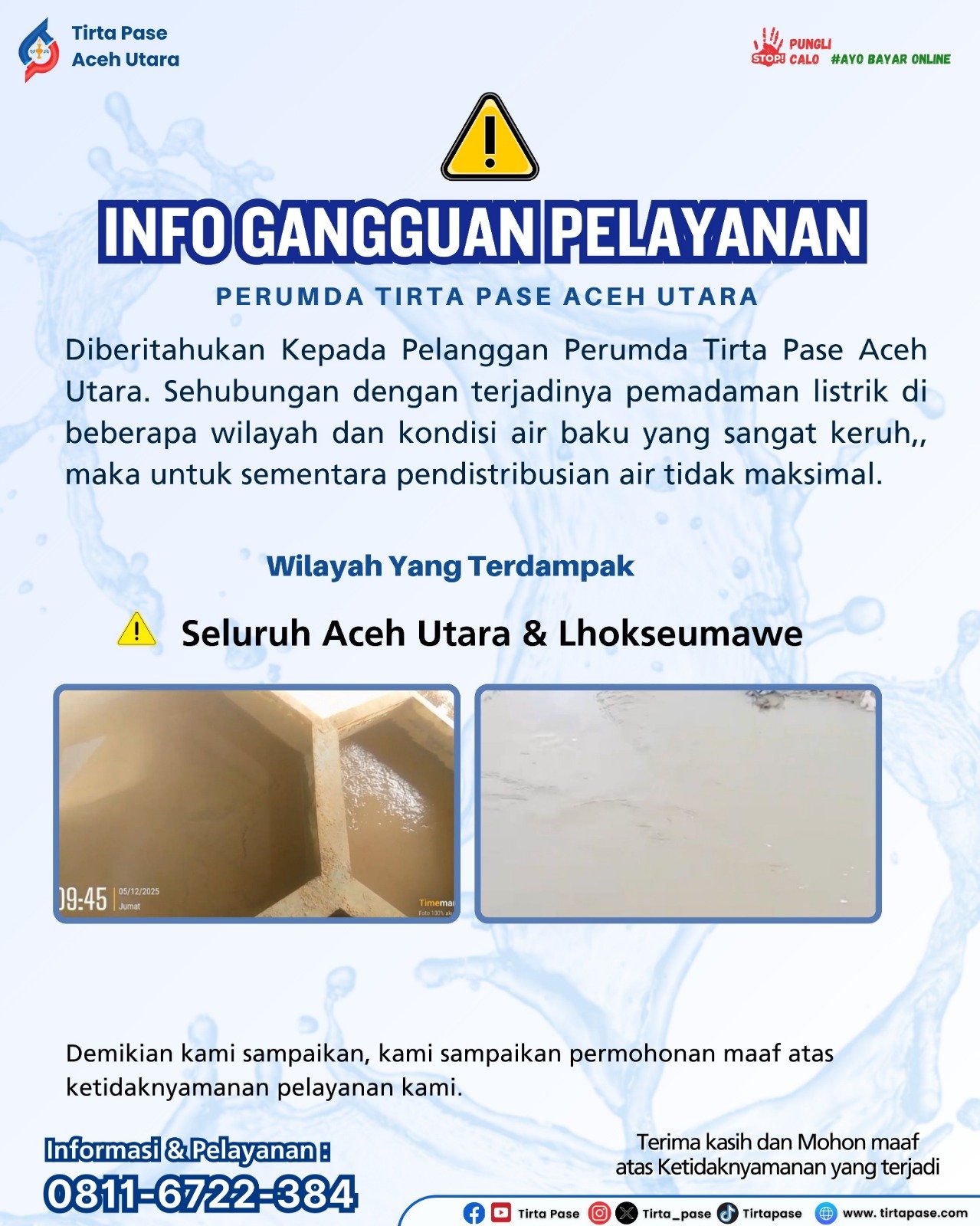 Sehubung dengan terjadinya pemadaman listrik di beberapa wilayah dan kondisi air baku yang sangan keruh. maka untuk sementara pendistribusian air tidak maksimal.