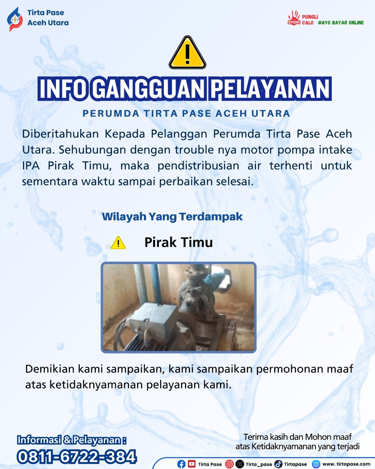 Sehubungan Dengan trouble nya motor pompa intake IPA pirak Timu, makan pendistribusian air terhenti untuk sementarawaktu sampai perbaikan selesai.