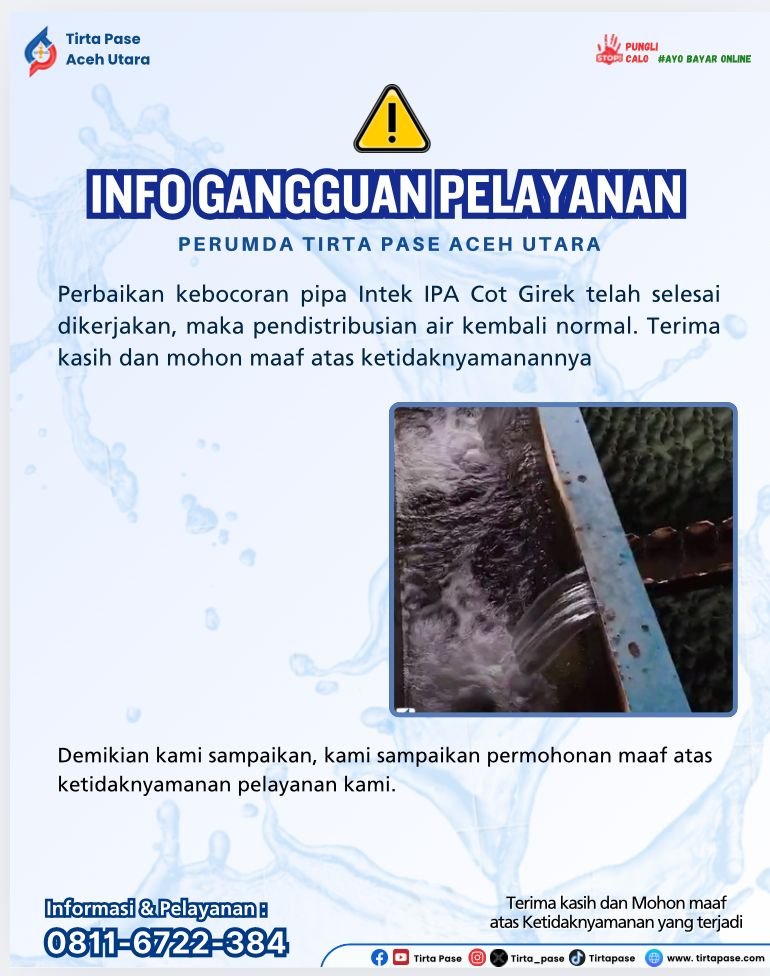 Diberitahukan Kepada Pelanggan Perumda Tirta Pase Aceh Utara, Sehubung perbaikan kebocoran pipa intek IPA Cot Girek telah selesai di kerjakan, maka pendistribusian air kembali normal. Terimakasih dan mohon maaf atas ketidaknyamanannya.