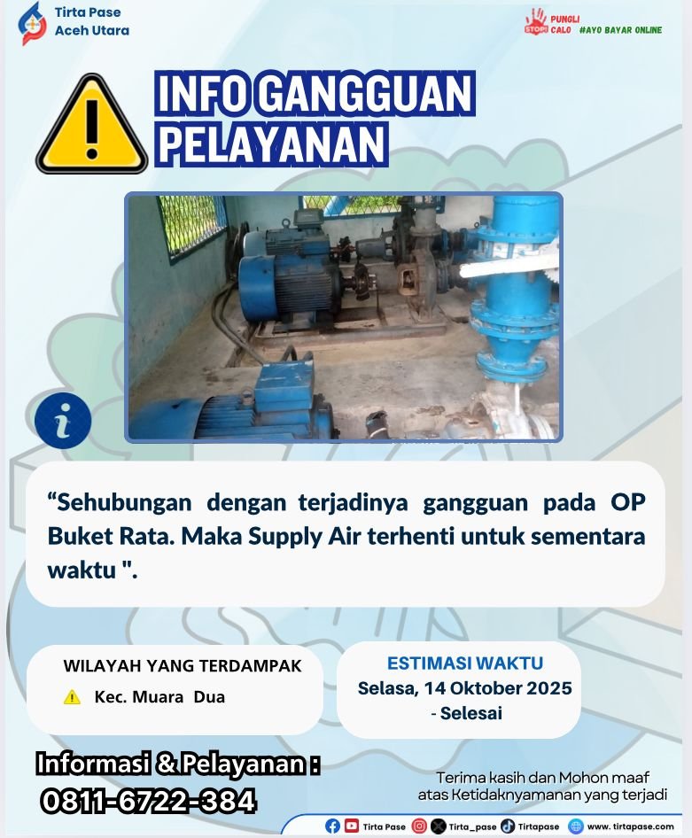Sehubungan dengan adanya Gangguan Pada OP Bukit Rata , Maka Pendistribusian Air Menjadi Kurang Maksimal Untuk Sementara Waktu Hingga Perbaikan Selesai Dilakukan.