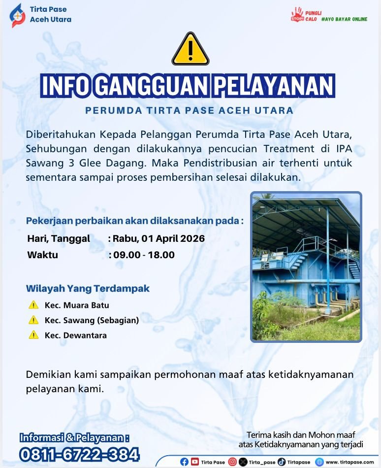 Diberitahukan Kepada Pelanggan Perumda Tirta Pase Aceh Utara, Sehubungan dengan dilakukan pencucian Treatment di IPA Sawang 3 Glee Dagang. Maka pendistribusian Air terhenti sementara sampai proses pembersihan selesai dilakukan.