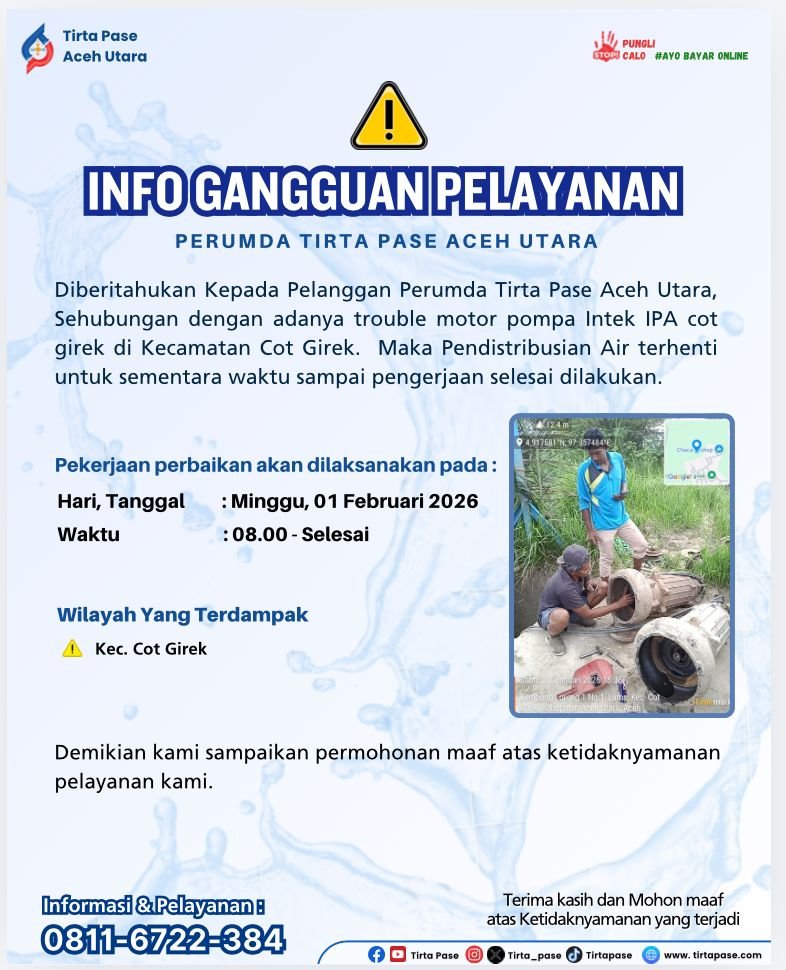 Diberitahukan kepada Pelanggan Perumda Tirta Pase Aceh Utara, sehubungan dengan adanya trouble motor pompa Intek IPA Cot Girek di Kecamatan Cot Girek, maka pendistribusian air terhenti untuk sementara waktu sampai pengerjaan selesai dilakukan.