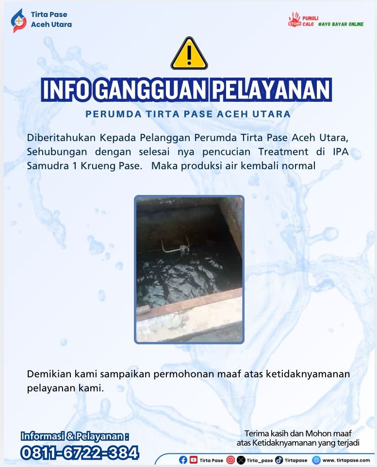 Diberitahukan Kepada Pelanggan Perumda Tirta Pase Aceh Utara, sehubungan dengan dilakukannya pencucian Treatment di IPA Teupin Punti, maka pendistribusian air terhenti untuk sementara sampai proses pembersihan selesai dilakukan.