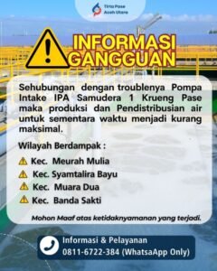 Sehubungan dengan adanya Trouble Pipa Intake IPA Samudera 1 Krueng Pase, Maka Pendistribusian Air Menjadi…